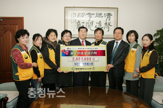 대전광역시 서구 자원봉사회(회장 손석락)은 21일 『서람이 알뜰장터』를 운영하고 판매수익금 전액 2,400,000원을 이웃돕기 성금으로 써달라며 가기산 서구청장에 전달했다.