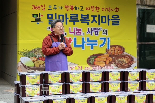 이원재 행정중심복합도시건설청장은 행복도시 주부모니터단과 함께 21일 도담동에 위치한 노인복지주택 밀마루복지마을에서 열린 ‘사랑의 김장김치 나눔’행사에 참여했다.