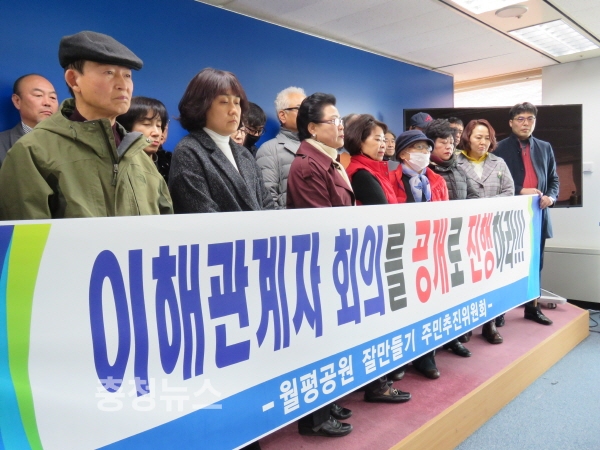 이와 함께 기자회견을 진행한 월평공원 지주협의회는 “엊그제 이해관계자 회의에 처음 참석했다. 꼭 나와 달라해서 없는 시간을 빼서 갔더니 반대만 하고 나오지도 않고 회의도 못하고 시간만 보냈다”며 “이렇게 가다가는 내년 봄이 돼도 결론이 나지 않을 것”이라고 아쉬움을 토로했다.