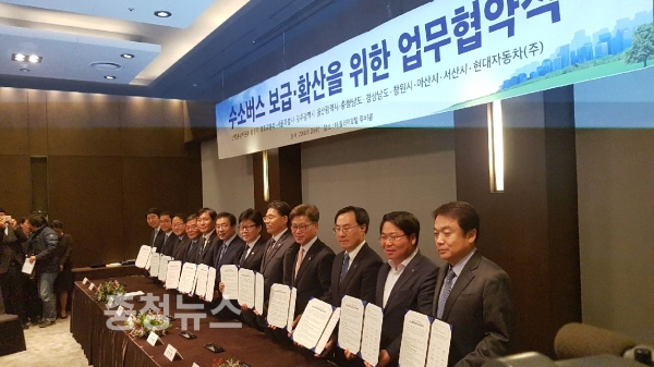 양해각서 체결은 조명래 환경부장관, 성윤모 산업통산자원부장관, 김정렬 국토부2차관, 현대자동차 정진행 사장과 오세현 아산시장 등 8개 특별・광역・기초 단체장이 참석해 「수소버스 시범사업의 원활한 추진」과 「수소버스의 확산」, 「수소버스의 시범사업에 대한 홍보강화」에 대한 업무협약으로 진행됐다.
