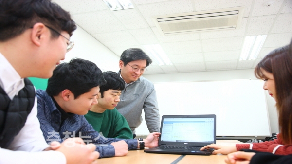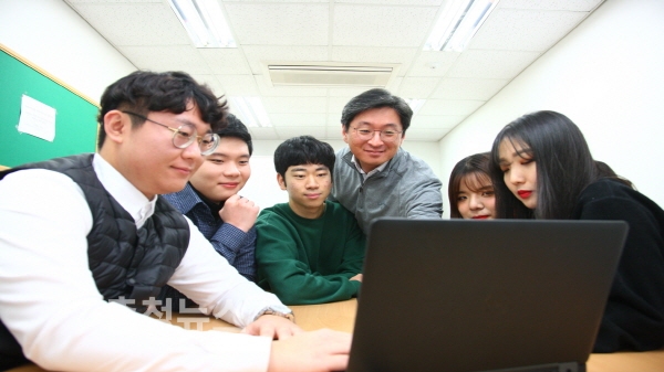 한남대 글로벌IT경영학과 학생들이 김태완 담당 교수와 함께 수업 중 경영전략게임을 하고 있다.