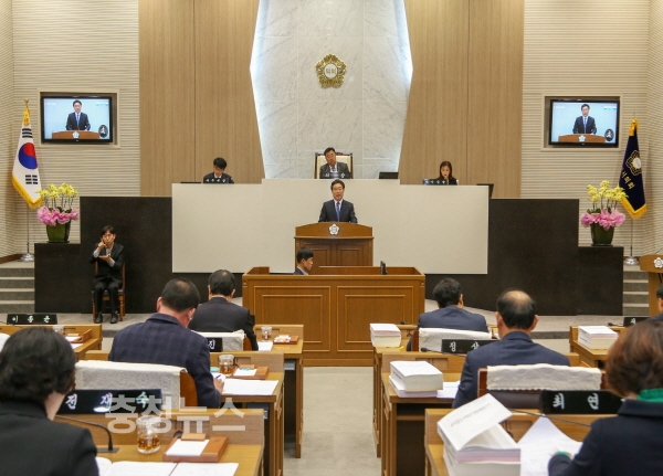 김홍장 당진시장이 23일 당진시의회 본회의장에서 열린 제58회 당진시의회 제2차 정례회 개회식에서 민선7기 첫 시정연설을 했다.