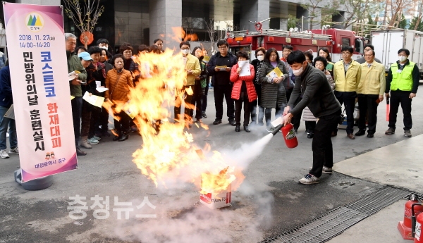 대전 중구(구청장 박용갑)는 27일 제409차 민방위의 날을 맞아 겨울철 안전사고 예방을 위한 ‘화재대피 훈련과 생활안전 교육’을 코스트코 대전점에서 실시했다.