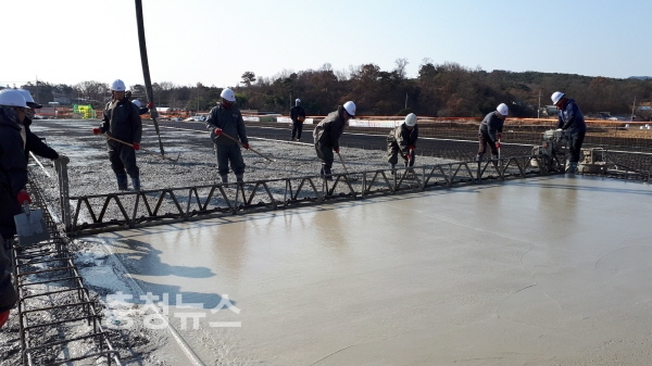 공사는 통로암거 2개소, 수로암거 2개소 완료, 내덕 1교 슬라브 콘크리트 양생 등을 진행, 공정률 15%를 기록 중이다.
