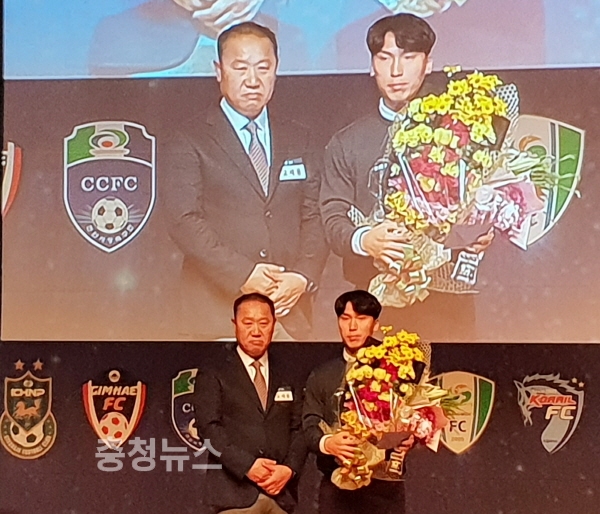 천안시청 축구단의 오윤석 선수가 지난 27일 서울 백범기념관에서 열린 2018 내셔널리그 어워즈에서 베스트 11 수비수에 선정돼 기념사진을 찍고 있다.