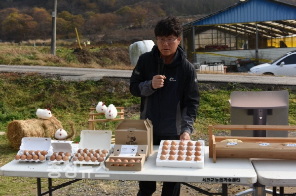 이날 평가회는 기존의 동물복지축산 인증농가인 박대수(마산면 벽오리)씨를 대표로 소규모 산란계 10개 농장이 참여해 동물복지형 사육방식을 적용하고 자가사료를 공동 생산 급여하는 등 규모는 작지만 소비자가 원하는 안전한 계란 생산 모델을 제시하는 자리로 마련됐다.