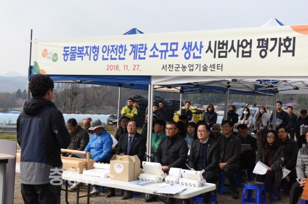 충남 서천군농업기술센터(소장 석희성)는 지난 27일 마산면 벽오리농장(대표 박대수)에서 ‘동물복지형 안전한 계란 소규모 생산 시범사업’평가회를 개최했다.