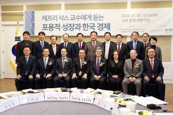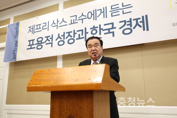 문 의장은 “제프리삭스 교수께서 오늘 ‘포용적 성장과 한국경제’를 주제로 강연을 해주신다고 들었다”면서 “포용적 성장은 불평등 해소를 통해 성장 동력을 얻는 것이 핵심이다. 기회의 균등이 보장되고, 경제적 성장을 통하여 물질적·비물질적 혜택이 공평하게 분배되어야 지속가능한 성장이 이어질 수 있다는 이론”이라고 말했다.