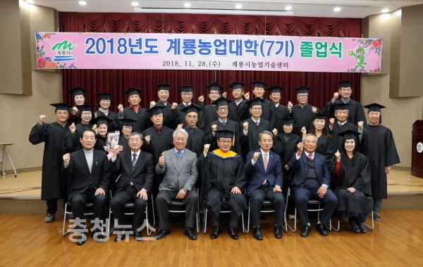 시는 28일 농업기술센터에서 최홍묵 시장, 박춘엽 시의회 의장을 비롯한 졸업생 가족 등 50여명이 참석한 가운데 제7기 계룡농업대학 도시농업학과 졸업식을 가졌다.