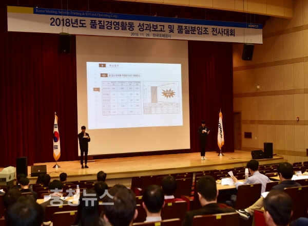 한국조폐공사(사장 조용만)는 경영 모토인 ‘국민 퍼스트(First), 품질 베스트(Best)’ 실현을 통한 공기업의 사회적 가치 달성을 위해 29일 대전 본사 정보관에서 ‘2018년 품질경영활동 성과보고 및 전사 품질분임조 발표대회’를 개최했다.