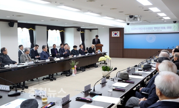 대전 서구(구청장 장종태)는 구청 대회의실에서 충남대학교 명예교수회 이사회 (회장 유병주) 30명을 초청, 서구 발전방안에 대한 고견을 듣는 ‘행복 담은 마중물 대화방’ 행사를 했다고 29일 밝혔다.