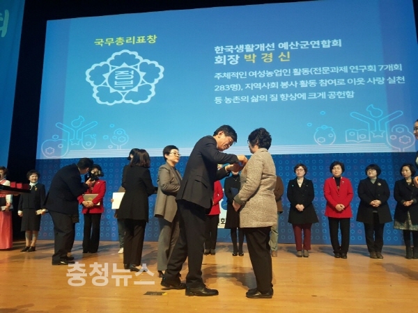 충남 예산군농업기술센터는 지난 29일 코엑스에서 개최된 생활개선회 활동 60주년 기념식에서 한국생활개선예산군연합회 박경신 회장(62세)이 국무총리상을 수상했다고 밝혔다.