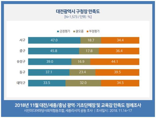 부정평가는 34.4%로 대전 5개 구 가운데 가장 낮은 것으로 조사됐다.