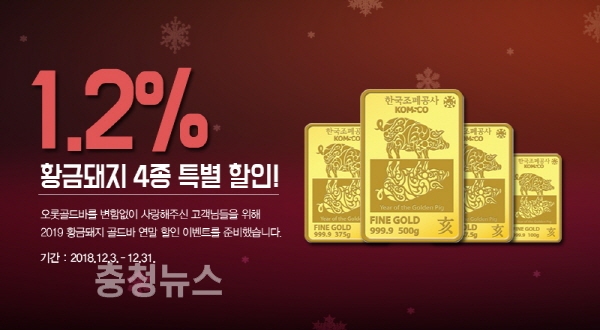한국조폐공사(사장 조용만)가 2019년 기해년(己亥年) ‘황금 돼지의 해’를 앞두고 행복하고 풍요로운 새해를 기원하는 ‘돼지의 해 골드바’ 4종 할인 판매 및 오롯 골드바 구매시 사은품 지급 이벤트를 3일부터 이달 31일까지 실시한다.
