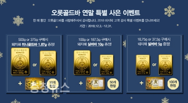 이와 함께 ‘오롯 골드바’ 구매 고객에 사은품을 주는 이벤트도 진행한다. 골드바 18.75g 이상을 구매할 경우 중량별로 ‘2019년 돼지해 미니 골드바(1.87g)’, ‘2019년 돼지해 실버바(5g, 10g)’ 사은품을 증정한다.