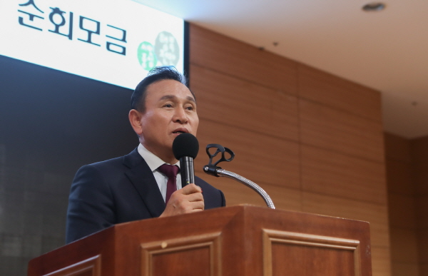 천안시 순회모금 행사에서 구본영 천안시장 인사말 모습