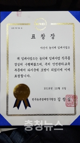 충남 아산시농업기술센터(소장 유지원)는 지난 6일 한국농촌경제연구원 주관으로 천안 상록리조트에서 열린 “농기계 임대사업 워크숍”에서 “안전관리·교육 부문 우수사업소”로 선정돼 한국농촌경제연구원상을 수상했다고 밝혔다.