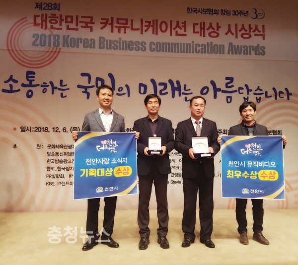 지난 6일 사단법인 한국사보협회 주최로 서울 한국프레스센터에서 열린 ‘2018 대한민국 커뮤니케이션 대상’ 시상식에서 천안시 시정 소식지 ‘천안사랑’이 인쇄사보 공공부문 기획 대상을 받고, 홍보 뮤직비디오 ‘헤븐시티(Heaven City)’가 홍보영상물 부문 최우수상을 받았다.