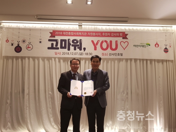 대전종합사회복지관 주관 ‘자원봉사자·후원자 감사의 밤’행사에서 나눔의 복지사회 실현에 이바지한 공으로 대전시 대덕구청상을 수상했다.