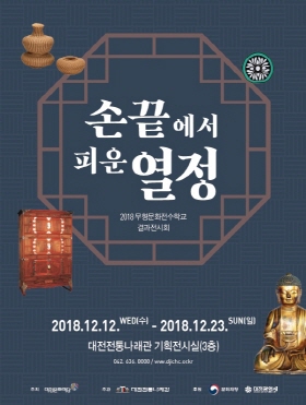 대전문화재단(대표이사 박만우)이 12일부터 23일까지 대전전통나래관 3층 기획전시실에서 2018 무형문화 전수학교 결과전시회 ‘손끝에서 피운 열정’을 진행한다.