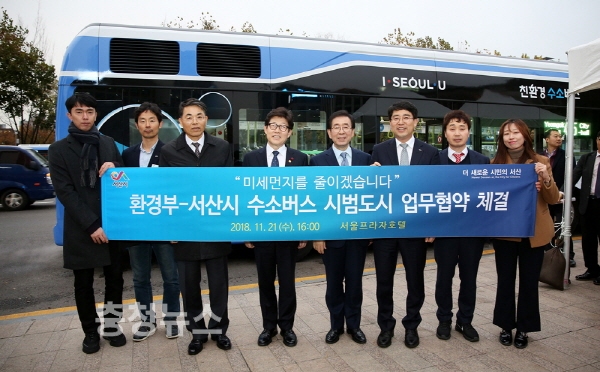 맹정호 서산시장이 환경부장관, 서울시장 등과 수소버스 시범도시 업무협약 기념촬영을 하고 있다