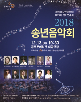 충남 공주시충남연정국악원은 13일 공주문예회관 대공연장에서 「2018 송년음악회」를 개최한다. 다사다난 했던 戊戌年 한해를 마무리하고, 2019년 己亥年을 맞이하며 「신바람 공주, 활기찬 미래」에 대한 설렘과 기대를 모아 신명나고 다양한 국악 프로그램으로 시민들을 찾아갈 예정이다.