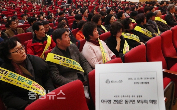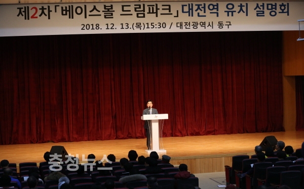 대전 동구(구청장 황인호)는 13일 구청 12층 대강당에서 주민과 직원 등 500여 명이 참석한 가운데 제2차 베이스볼 드림파크 대전역 선상 유치 설명회를 개최했다.