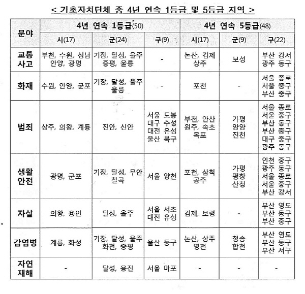 또한 충남 공주시도 생활안전분야에서 4년 연속 5등급을 기록해 낮은 수준을 보였다.