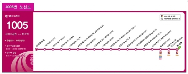 1005번의 경우 1,2생활권 주민들의 불편을 해소하기 위하여 오전 06시부터 22시 30분까지 은하수공원을 출발하여, 고운동↔다정동↔ 새롬동을 거쳐 반석역까지 30분 간격으로 1일 편도 69회가 운행되고,