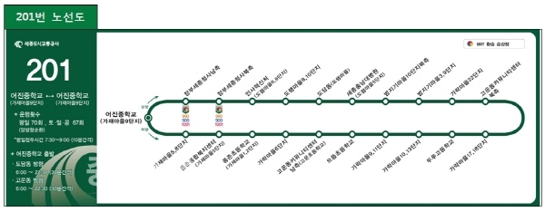 1생활권을 순환하는 201번(어진중~정부세종청사~도담동~고운동~종촌동~어진중) 노선은 06시부터 22시 30분까지 출근시간대(07:30∼09:00)에는 10분 간격으로 운행되고, 비첨두시에는 15분 간격으로 1일 140회를 운행하면서 BRT와의 연계를 도모하게 된다. 다만 주말과 공휴일에는 15분 간격으로 운행된다.