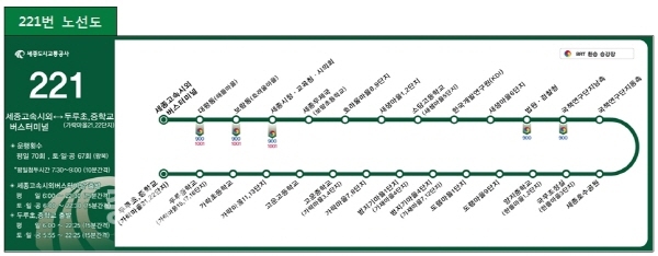 1생활권과 3,4생활권을 연결하는 221번(두루초・중~고운,아름・종촌동~호수공원~국책연구단지~세종시청~세종버스터미널) 노선은 세종버스터미널 기준, 06시부터 22시 30분까지 출근시간대(07:30∼09:00)에는 10분 간격으로, 비첨두시에는 15분 간격으로 1일 140회를 운행한다. 다만 주말과 공휴일에는 201번과 동일하게 15분 간격으로 운행된다.