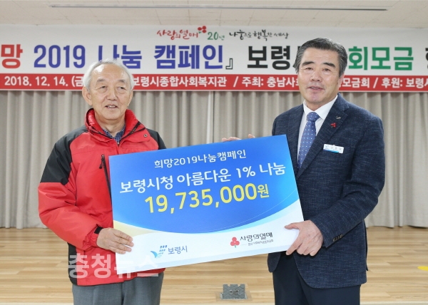 한편, 충남도공동모금회와 함께하는“희망 2019 나눔 캠페인”은 내년 1월 31일까지 진행되며, 나눔 캠페인에 참여하지 못한 시민은 보령시 주민생활지원과(☎041-930-3382) 또는 읍면동사무소에 성금을 기탁하면 된다.