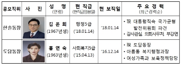 한솔동장 추천 주민심의위원회와 도담동장 추천 주민심의위원회는 12일과 13일 각각 위원회를 열어 한솔동장에는 김온회 사무관, 도담동장에는 홍영숙 사무관을 추천했다.