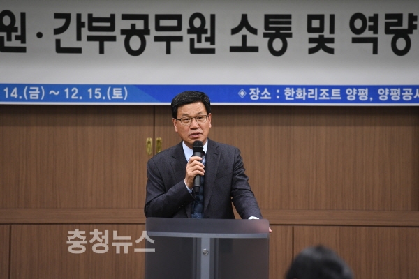 청양군의회 의원·5급이상 간부공무원 양평서 워크숍에서 김돈곤 군수 인사말 모습