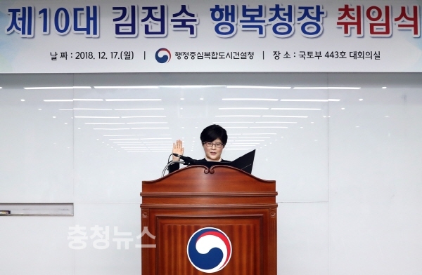김진숙 심임청장은 취임사에서 그간 행정중심복합도시(이하 행복도시)건설 사업에 노고가 많은 직원들을 격려하면서 “막중한 책임감을 느낀다”고 말했다.