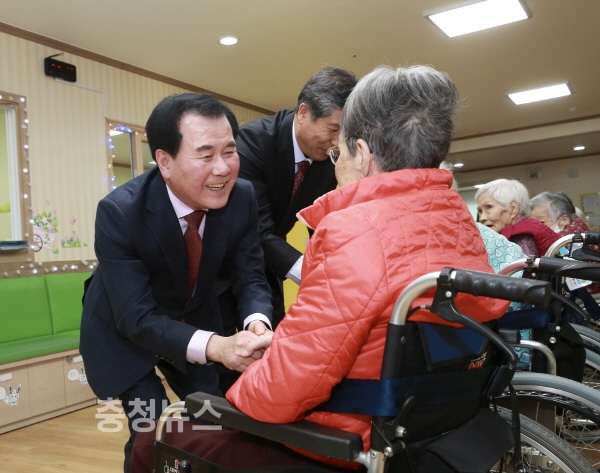 충남 당진시 합덕읍에 위치한 좋은 이웃노인전문요양원에서 김지철 충남교육감이 할머니와 인사나누고 있다.