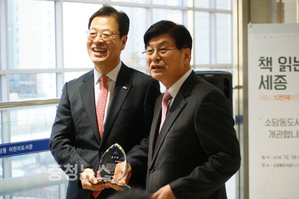 이춘희 시장은 소담동 도서관에 아름人 도서관을 조성하여 지역주민을 위한 독서문화 환경 조성에 기여한 신한카드에 감사패를 전달했다.