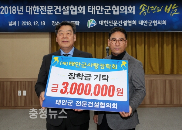 한편 같은날 태안군 전문건설협의회(회장 이상웅)도 송년의 밤 행사의 일환으로 열린 기탁식을 통해 (재)태안군사랑장학회에 300만 원을 기탁했다.