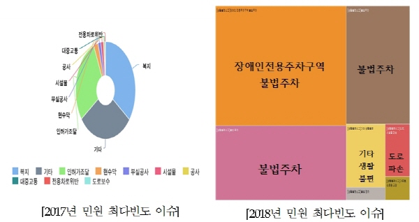 군에 따르면 2017년~2018년 새올민원접수현황을 활용한 행정안전부 빅데이터 플랫폼인 ‘혜안’ 시스템 테마분석과 표준분석을 통해 분석한 최다빈도 민원이슈는 17년에는 생활 수급, 기초 생활, 한부모가족 등의 복지 민원이 가장 많았지만 18년에는 불법주정차, 도로파손, 가로등·신호등 고장 등 도로교통 관련 민원이 가장 많았던 것으로 나타났다.