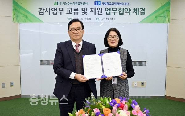 한국농수산식품유통공사(aT, 사장 이병호)와 사립학교교직원연금공단(이사장 이중흔)은 20일(목) 전남 나주 aT 본사에서 청렴문화 정착과 감사기구의 역량강화를 위한‘감사업무 교류 및 지원에 관한 협약(MOU)’을 체결했다.
