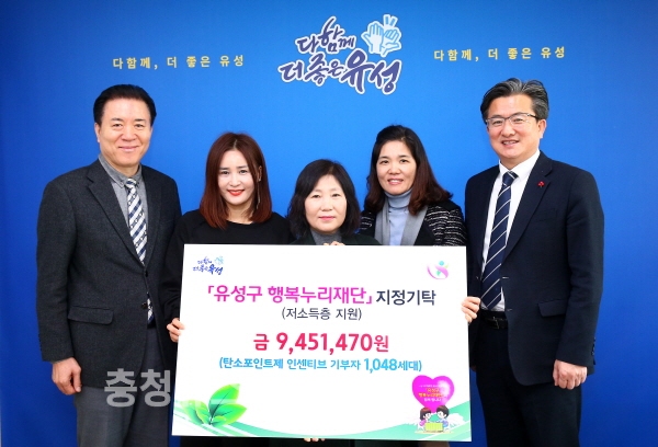 대전 유성구(구청장 정용래)는 21일 구청 행복사랑방에서 2018년 상반기에 발생된 탄소포인트제 기부 참여자의 인센티브액 945만원을 유성구 행복누리재단에 지정 기탁했다고 밝혔다.