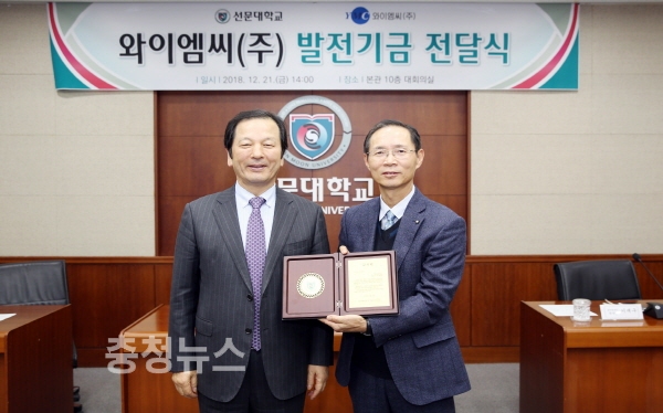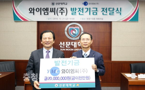 선문대학교(총장 황선조)는 21일 와이엠씨(주)(대표이사 이윤용)로부터 발전기금 2천만 원을 전달받았다고 밝혔다.