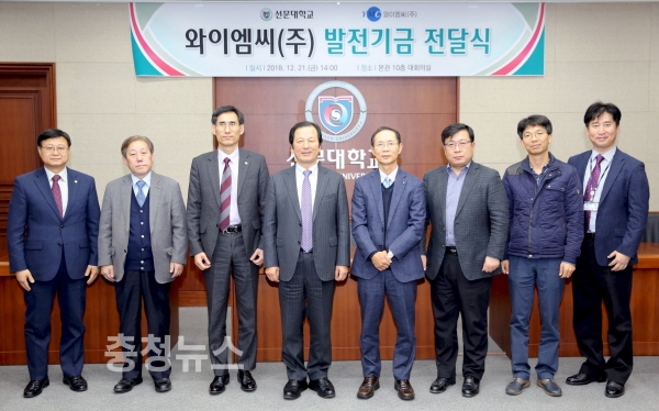 선문대 본관 10층 대회의실에서 진행된 발전기금 전달식에는 선문대 황선조 총장, 김범성 홍보∙대외협력처장, 오경식 사무처장이, 와이엠씨(주)에서는 이재구 부사장, 임헌기 상무, 한성규 차장이 참석했다.