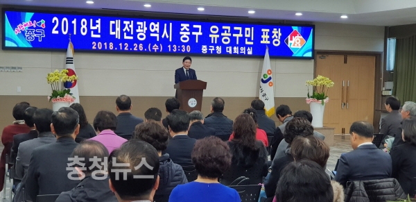 대전 중구(구청장 박용갑)는 26일 청사 대회의실에서 ‘2018년 중구를 빛낸 유공구민 표창식’을 개최했다.