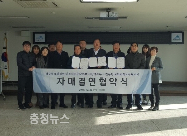 세종시 전동면(면장 전만익)과 전동면지역사회보장협의체가 26일 전동면사무소에서 한국석유관리원 대전세종충남본부(본부장 김완식)와 지역 내 소외계층 지원을 위한 자매결연 협약을 맺었다.