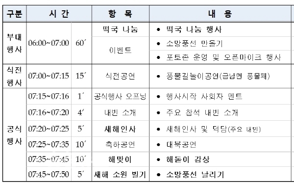 해맞이 행사는 대북공연과 소망풍선 날리기 등의 행사를 선뵈고, 황금 돼지를 배경으로 한 포토존과 대전적십자봉사회 세종시협의회에서 떡국을 제공할 예정이다.