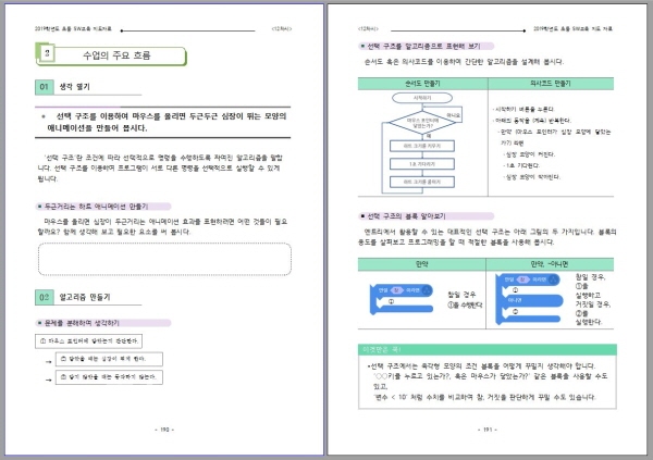 SW교육 지도자료는 총 17차시용으로, 각 차시마다 선생님과 학생들이 1~2개의 내용을 선택하여 활용할 수 있는 내용으로 구성되었으며, 겨울방학 전에 학교에 미리 보급하여 내년도 SW교육을 대비하도록 했다.