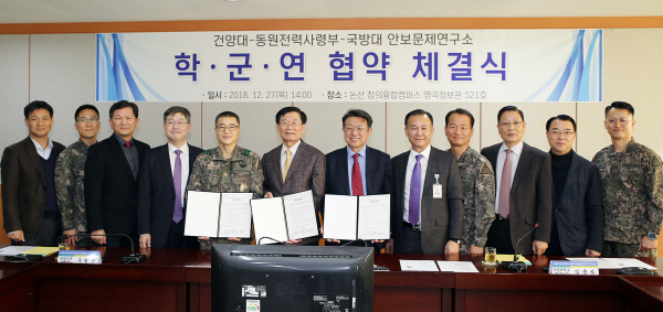 건양대학교(총장 이원묵)은 27일 논산 창의융합캠퍼스에서 동원전력사령부(사령관 구원근)과 국방대학교 국가안보문제연구소(소장 김준섭)와 함께 학·군·연 상호협력를 위한 MOU를 체결했다.