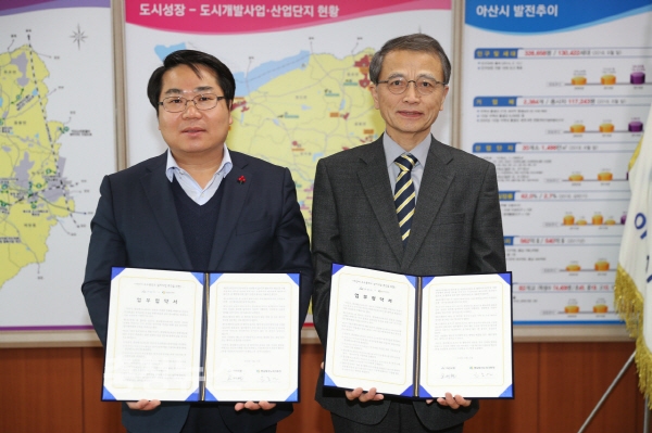 충남 아산시(시장 오세현)는 지난 27일 시장실에서 친환경 수소충전소 설치사업 공동 추진을 위해 충남테크노파크(원장 윤종언)와 MOU를 체결했다.
