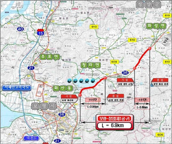 지난 2014년 4월 착공한 보령~청양 1공구는 총사업비 764억원을 투입하여 보령시 화산동에서 청양군 화성면 장계리까지의 기존 국도를 연장 6.9㎞, 폭 20m의 4차로 도로로 확․포장하는 사업이다.